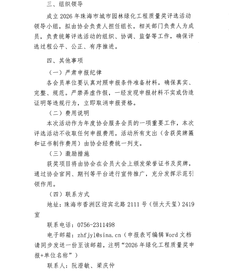 当前位置:首页 > 通知公告 > 关于开展2026年珠海市城市园林绿化工程质量奖评选活动的通知