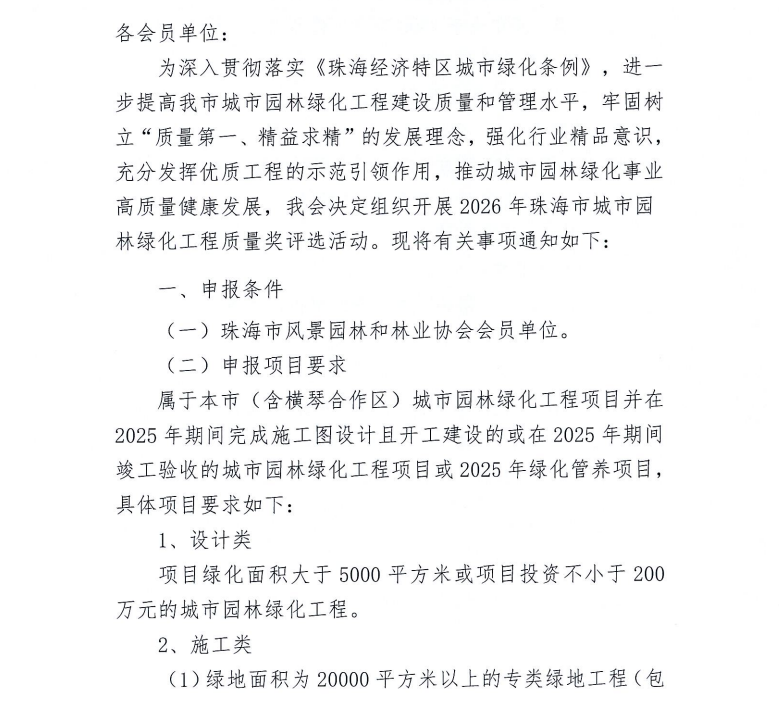 关于开展2026年珠海市城市园林绿化工程质量奖评选活动的通知